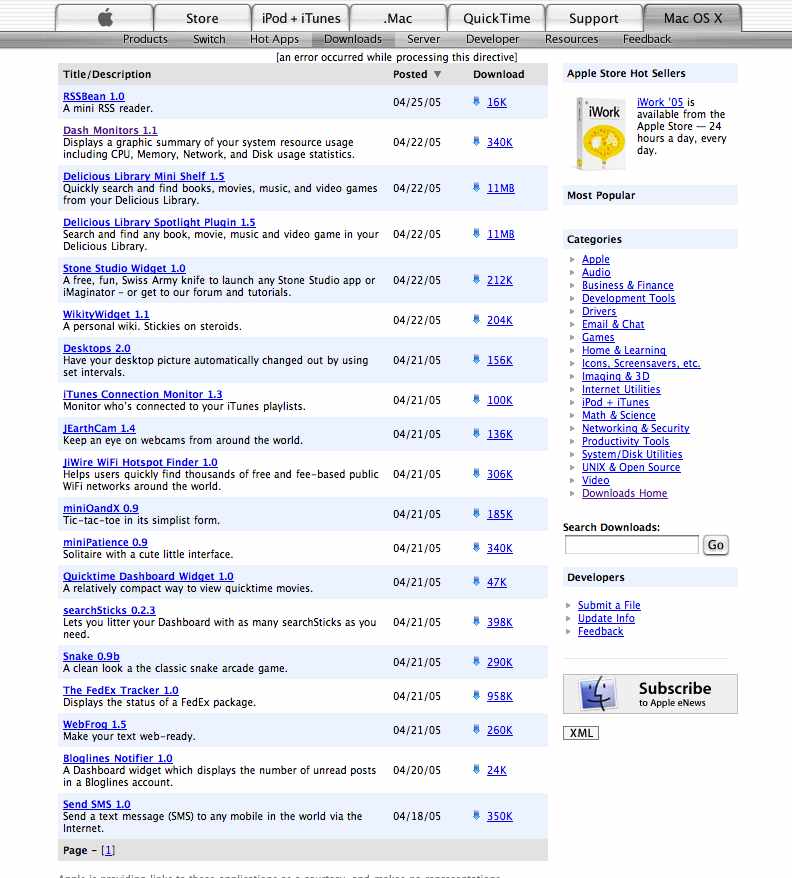 Just a few days to go until Tiger launches. Apple accidentally published their initial list of third-party dashboard widgets (then removed it again). Some interesting ones in there (a 16k RSS reader that could be modified quite easily I'm sure...)